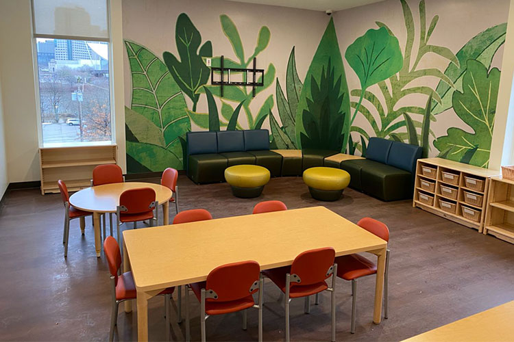 In our final design, guests will enter a warm, welcoming lobby. Colors and finishes were selected to lift spirits and make them feel at home. Wayfinding accents provide a pop of color, both cheerful and comforting. Our work included a children’s playroom and a place for kids to do homework and hang out. A custom wallcovering was created with leaves to bring the nature and the feel of the outdoors in. The prayer room is a place for healing, comfort, and respite for the women. Soft, textured seating, Zen-inspired wallcovering, and indirect lighting give the space a sense of calm. It is the first time an emergency shelter is implemented, that women and children will be housed together in the shelter.